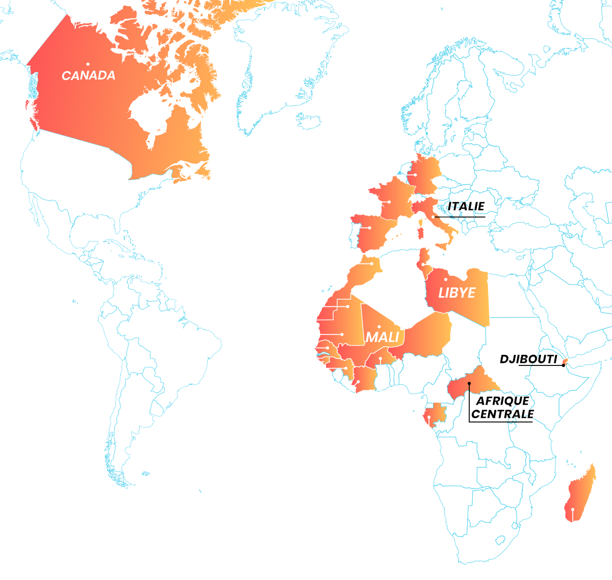 Elle collabore avec des partenaires dans différents pays sur les continents africain et européen tels que le Burkina Faso, la Côte d’Ivoire, le Mali, le Sénégal, la Mauritanie, la Guinée, la Libye, la France, l’Allemagne, ainsi que le Canada, et bien sûr en Tunisie, où elle est implantée.